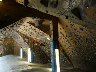 Høyden i buldrerommet er bra nok, men arealet er fort lite. Utnyttelsen av rommet slik det er i dag er relativt bra, men takoverhenget innerst til høyre er klart minst brukt og bør i såfall bli ofret til fordel for en mindre bratt vegg (30 grader)?